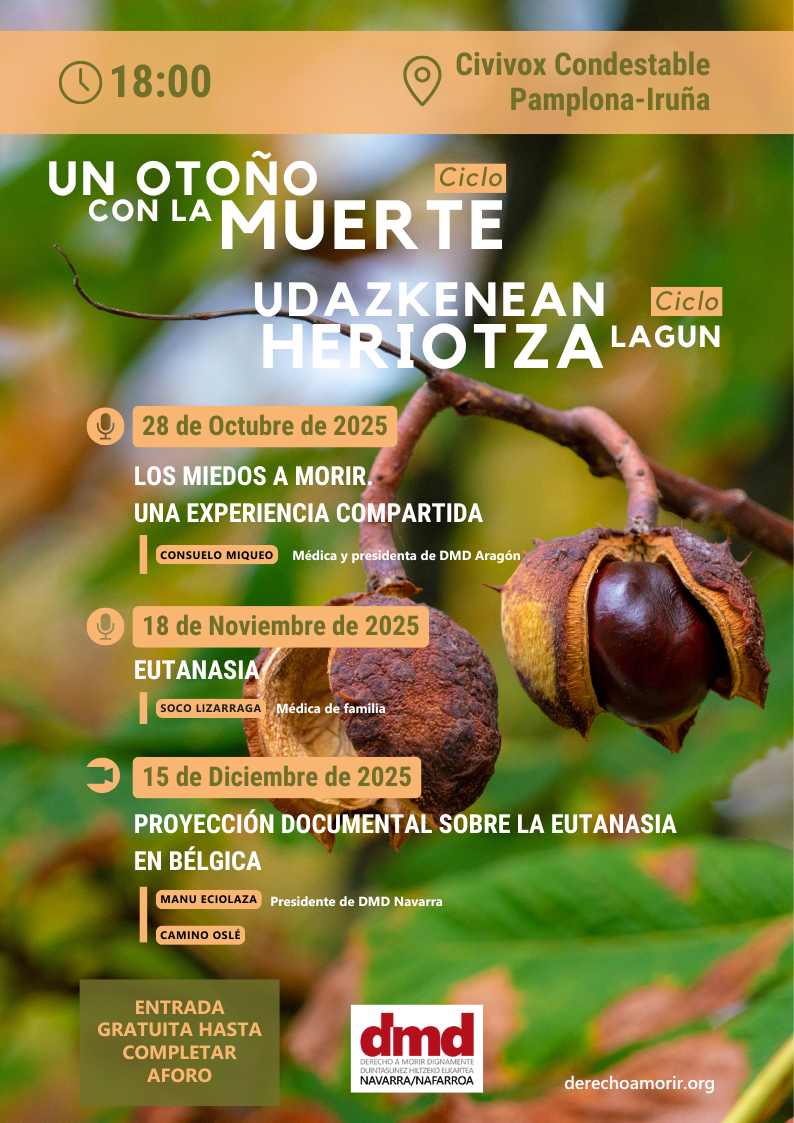 La asociación Derecho a Morir Dignamente (DMD) Navarra celebra un ciclo de actividades gratuitas para informar y reflexionar sobre los derechos al final de la vida con el título ‘Un otoño con la muerte’ que acogerá el Civivox Condestable (Calle Mayor, 2) de Pamplona-Iruña durante los meses de octubre, noviembre y diciembre.