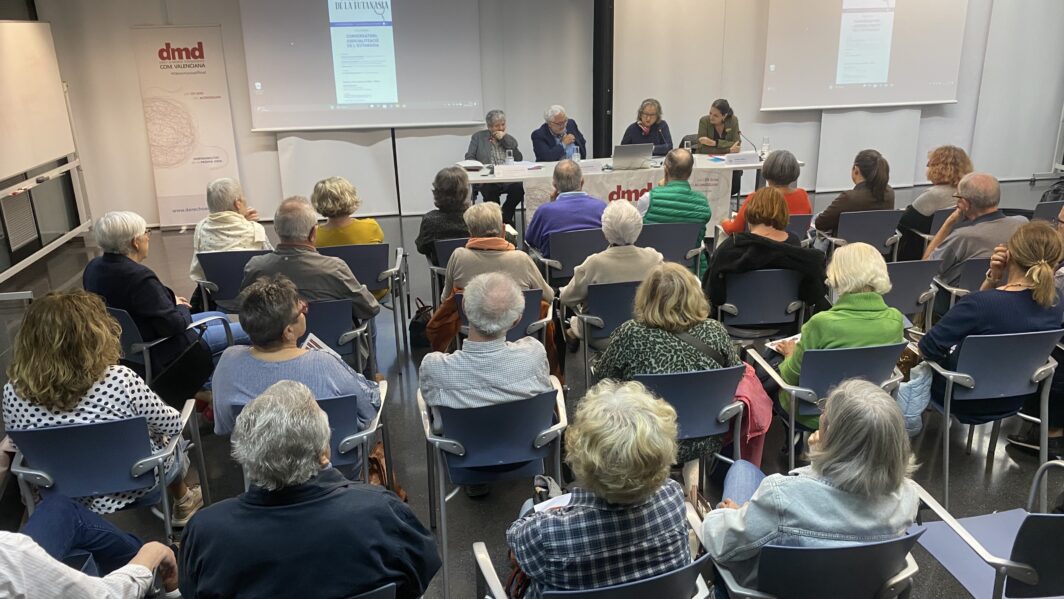 En una sesión presentada por María José Alemany, presidenta de la sección valenciana de DMD, intervinieron la profesora de Derecho Civil Fabiola Meco, miembro del Instituto de Derechos Humanos de la UV, quien fue diputada de la IX legislatura de Corts Valencianes, donde defendió la eutanasia y colaboró en la aprobación de la Ley Valenciana de Muerte Digna.