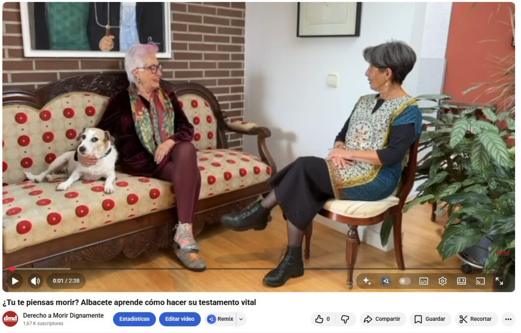 Blanca Calvo, presidenta, y María Castillo, vicepresidenta de Derecho a Morir Dignamente (Castilla-La Mancha), recuerdan en un vídeo la importancia de registrar el testamento vital (denominado declaración de voluntades anticipadas en esta autonomía). En este documento se puede dejar por escrito cómo queremos afrontar nuestra muerte, cómo queremos ser tratados, y qué es aquello que queremos y no queremos al final de nuestra vida.