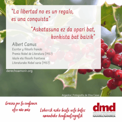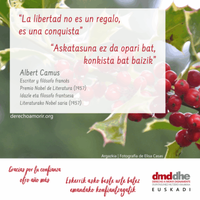 2026an bost urte beteko dira eutanasiaren legea onartu zenetik. Lortutako aurrerapenak aitortzeko aukera bat da, baina, aldi berean, pertsona orok bere bizitzaren jabe izateko eskubidea askatasunez gauzatzea oztopatzen duten mugak gainditzeko borrokan jarraitzeko motibazio izan behar du. Izan ere, Albert Camusek zioen bezala, “askatasuna ez da opari bat, konkista bat baizik”.