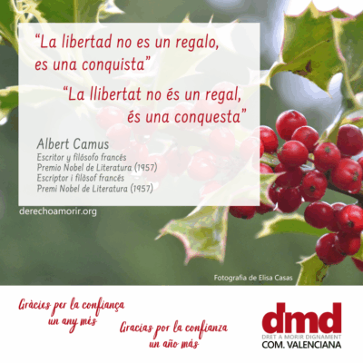 En 2026 es compliran cinc anys des de l’aprovació de la llei d’eutanàsia. Una ocasió per a reconéixer els assoliments aconseguits, però que també ens ha de servir de motivació per a lluitar per superar les limitacions que frenen el lliure exercici del dret de tota persona a disposar de la seua pròpia vida. Perquè, com deia Albert Camus, “la llibertat no és un regal, és una conquesta”.