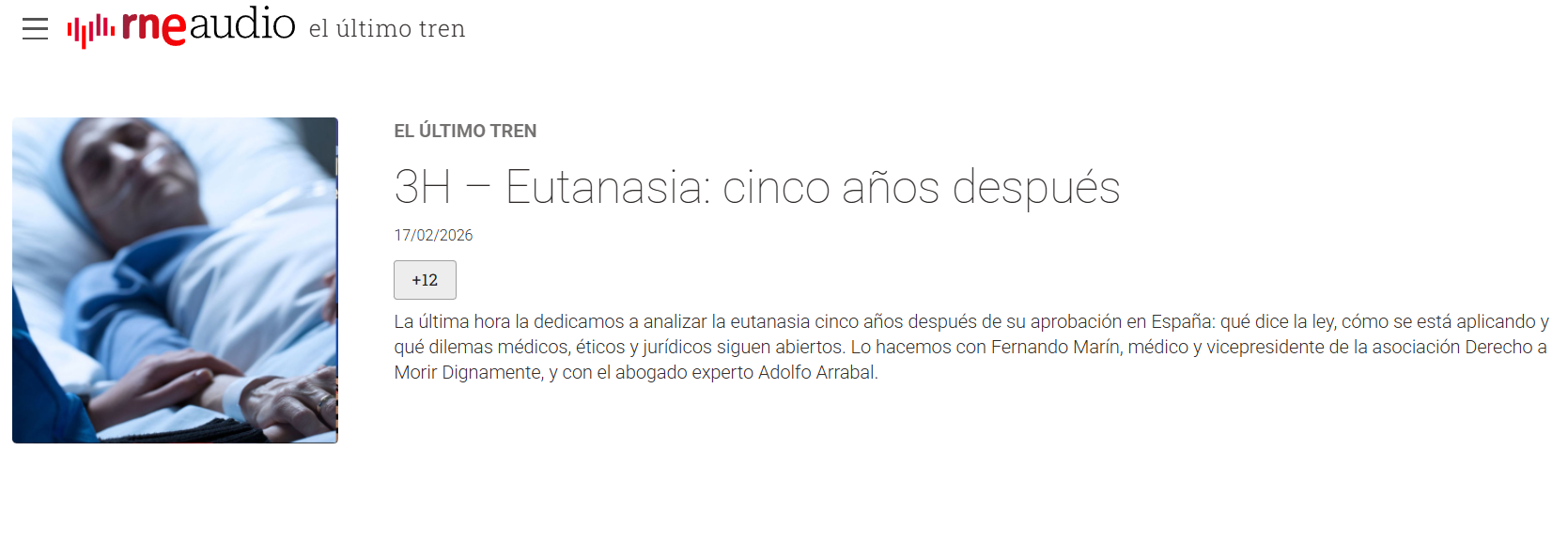 Fernando Marín, vicepresidente de DMD, y el abogado Adolfo Barreda, hablaron sobre la actual situación de la eutanasia y la muerte digna en el programa El último tren (RNE).