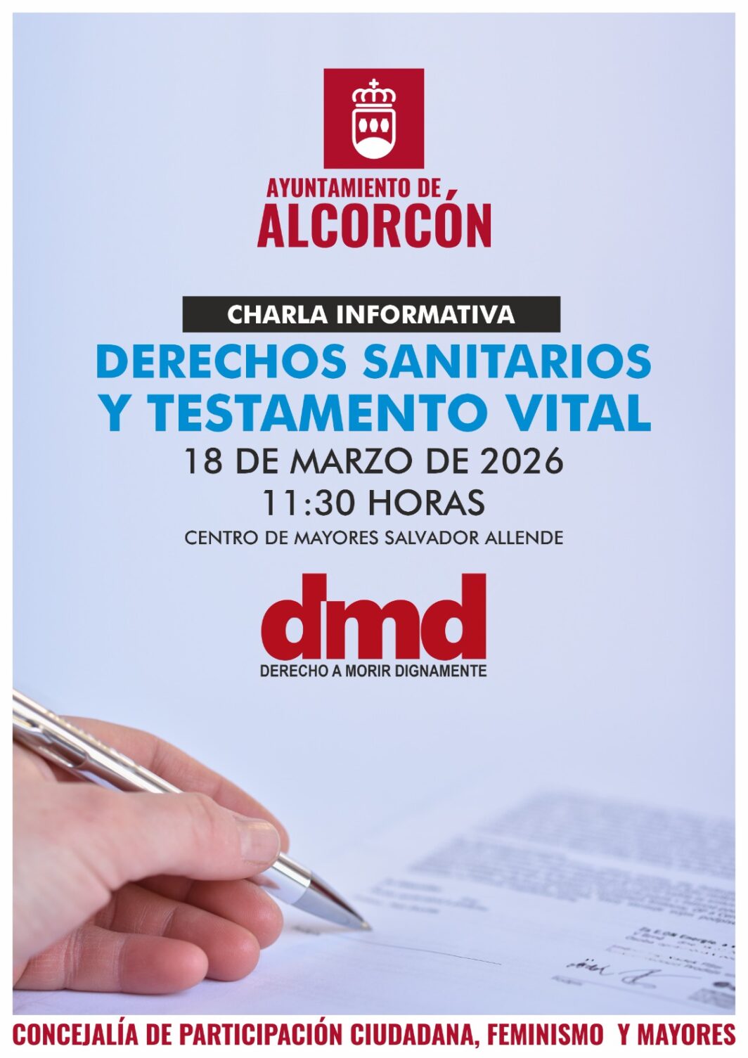 Queremos invitarte a la próxima charla coloquio que tendrá lugar el MIÉRCOLES, 18 DE MARZO, A LAS 11:30H. en el Centro de Mayores Salvador Allende, Calle Olímpico Aurelio García, 2 (Alcorcón). La actividad, organizada por el grupo local DMD Alcorcón, con la colaboración del Ayuntamiento del municipio, abordará el tema de: «Derechos sanitarios al final de la vida y testamento vital»