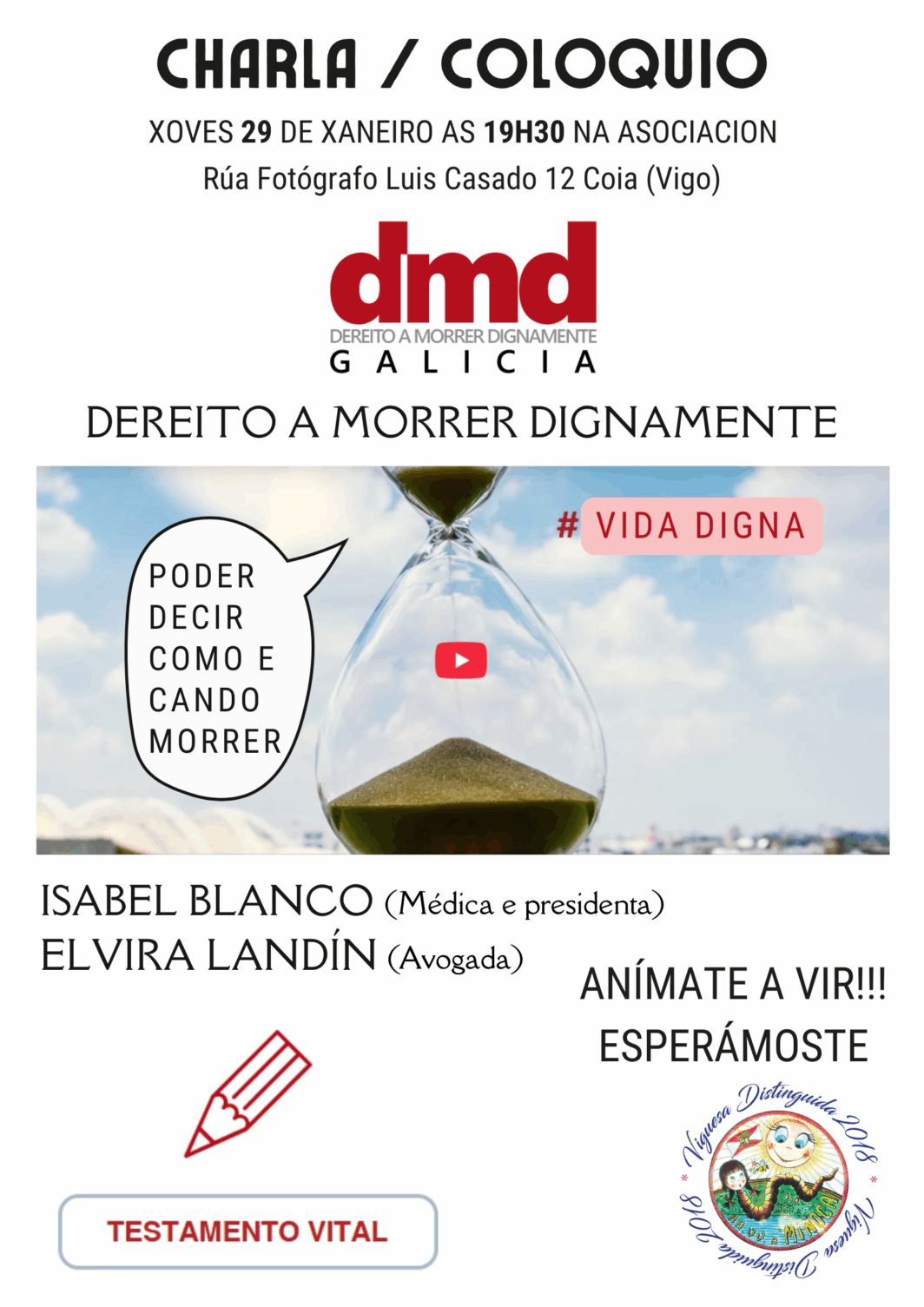 Derecho a Morir Dignamente (DMD) Galicia organiza la charla-coloquio Dereito a morrer dignamente el próximo jueves, 29 de enero a las 19,30 horas en la Asociación ubicada en la Rúa Fotógrafo Luis Casado, 12, de Coia (Vigo).