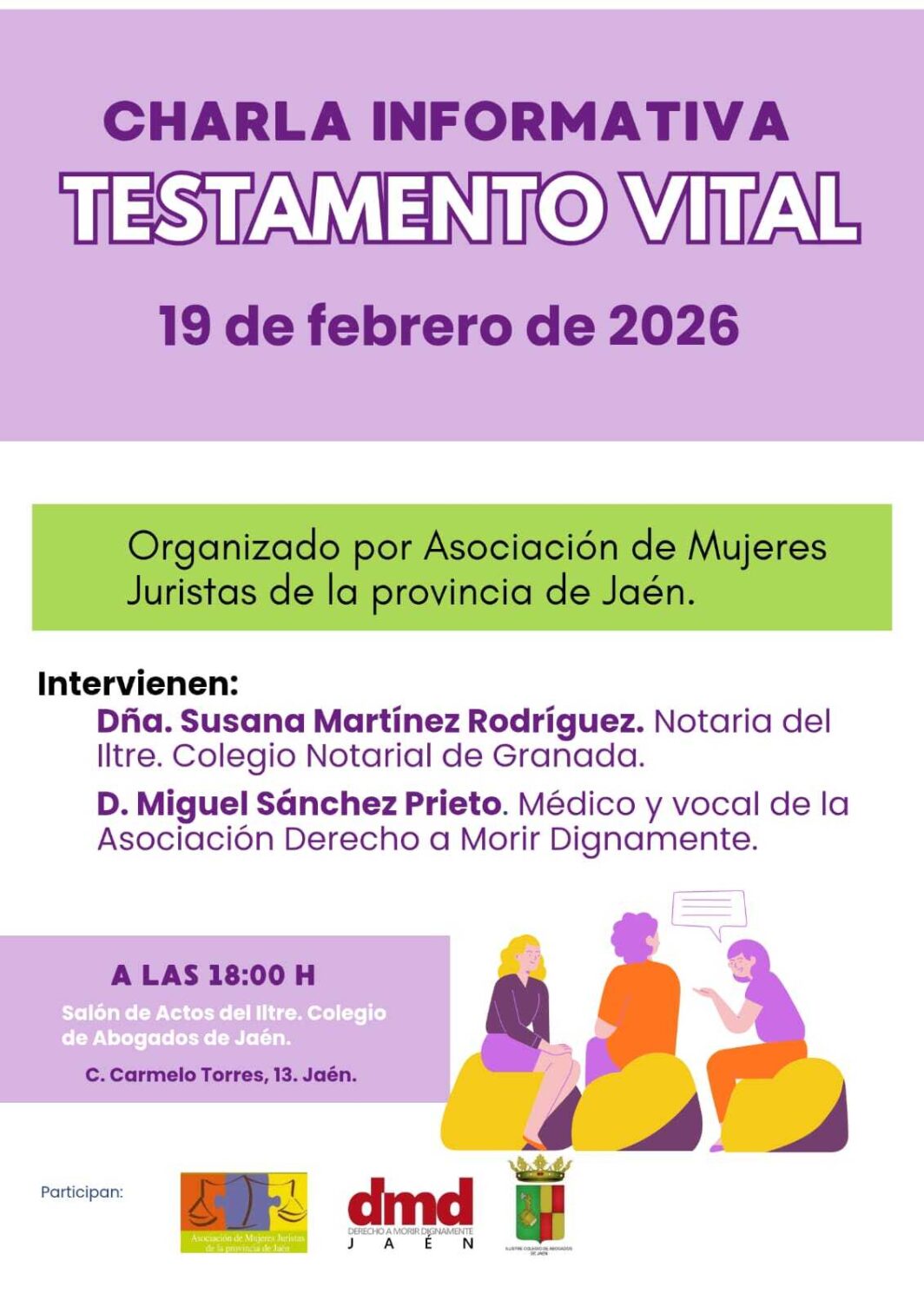 Derecho a Morir Dignamente (DMD) Jaén y la Asociación de Mujeres Juristas de la provincia de Jaén organizan una charla informativa sobre testamento vital el próximo 19 de febrero a las 18:00 horas en el Salón de Actos del Ilustre Colegio de Abogados de Jaén, ubicado en la calle Carmelo Torres, 13.