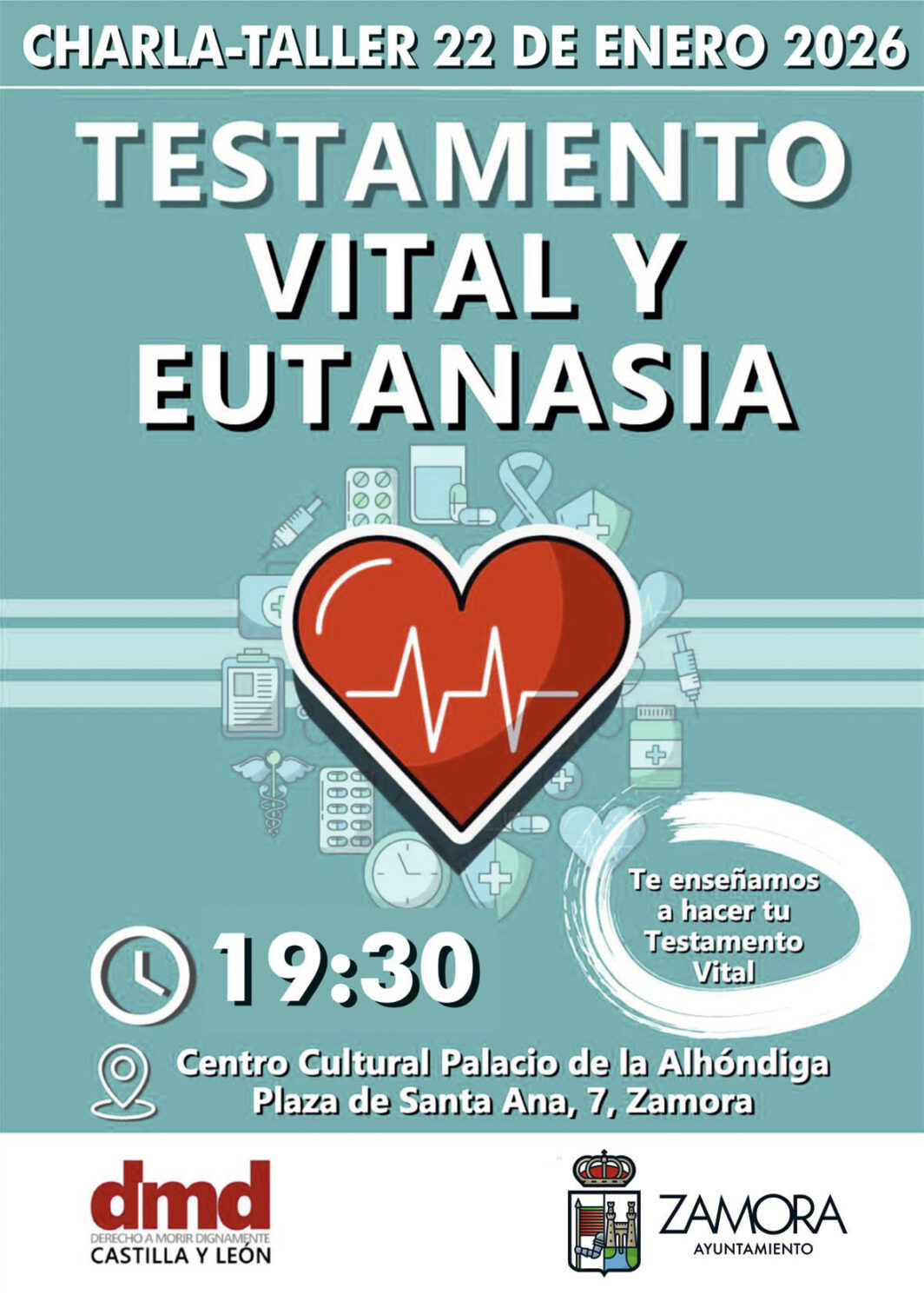 Derecho a Morir Dignamente (DMD) Castilla y León organiza una charla-taller sobre testamento vital y eutanasia el jueves 22 de enero, a las 19,30 horas en el Centro Cultural Palacio de la Alhóndiga, ubicado en la Plaza de Santa Ana, 7, de Zamora.