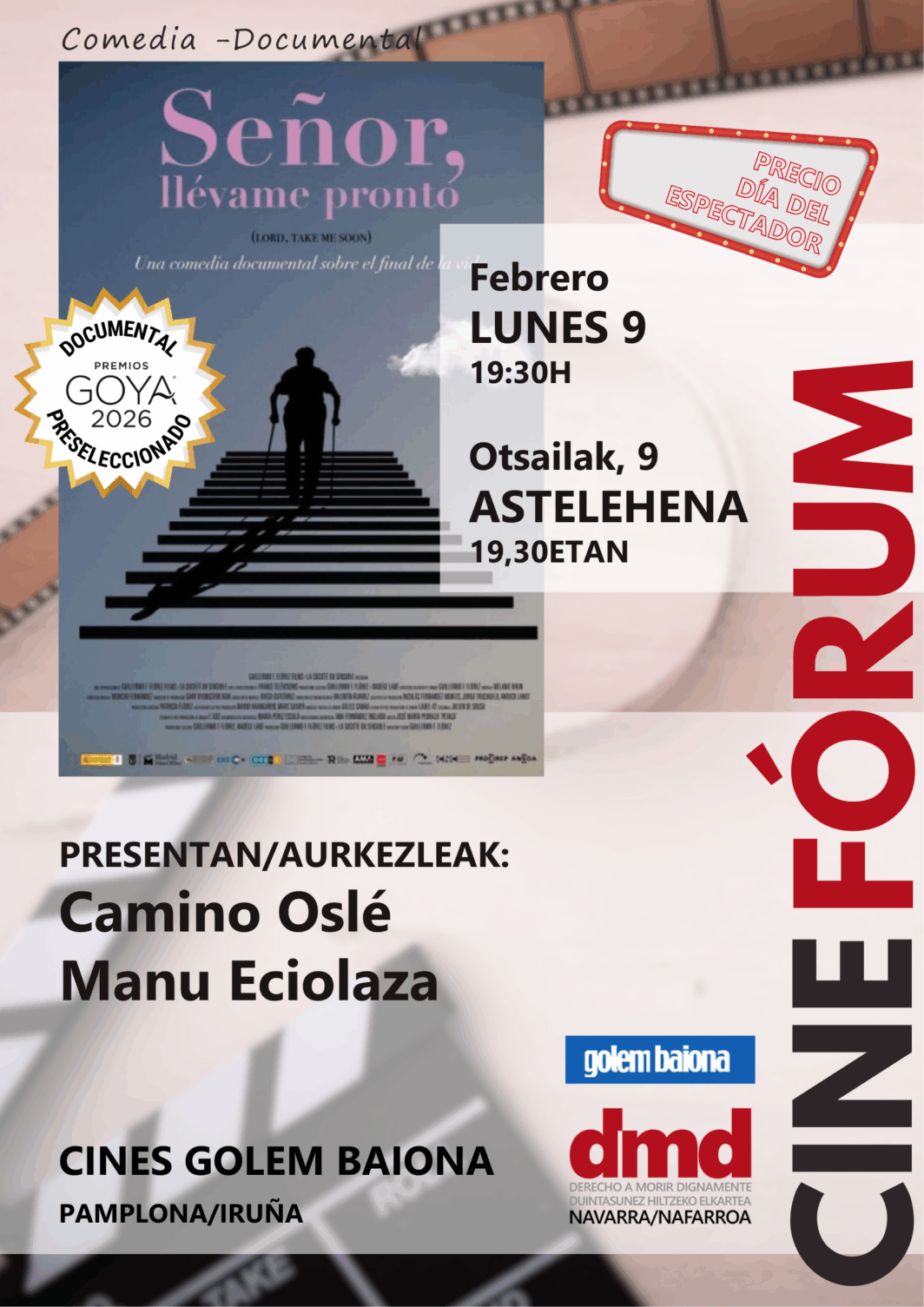 El encuentro estará presentado por Camino Oslé y Manu Eciolaza, de DMD Navarra. Cabe destaca que este documental está preseleccionado para los Premios Goya 2026.