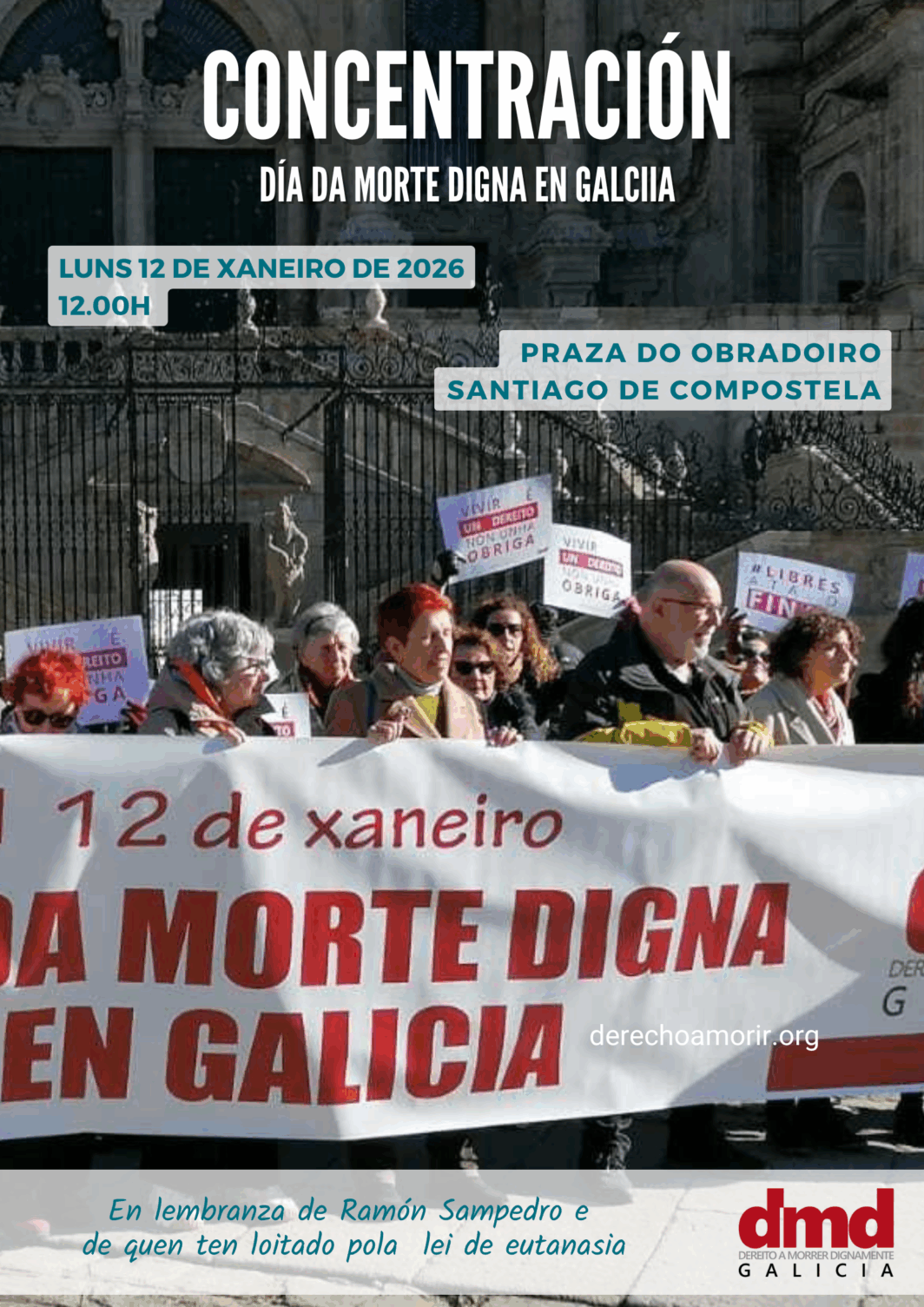 Derecho a Morir Dignamente (DMD) Galicia convoca a la concentración que tendrá lugar el próximo lunes 12 de enero a las 12:00 horas en la Plaza do Obradoiro, en Santiago de Compostela.