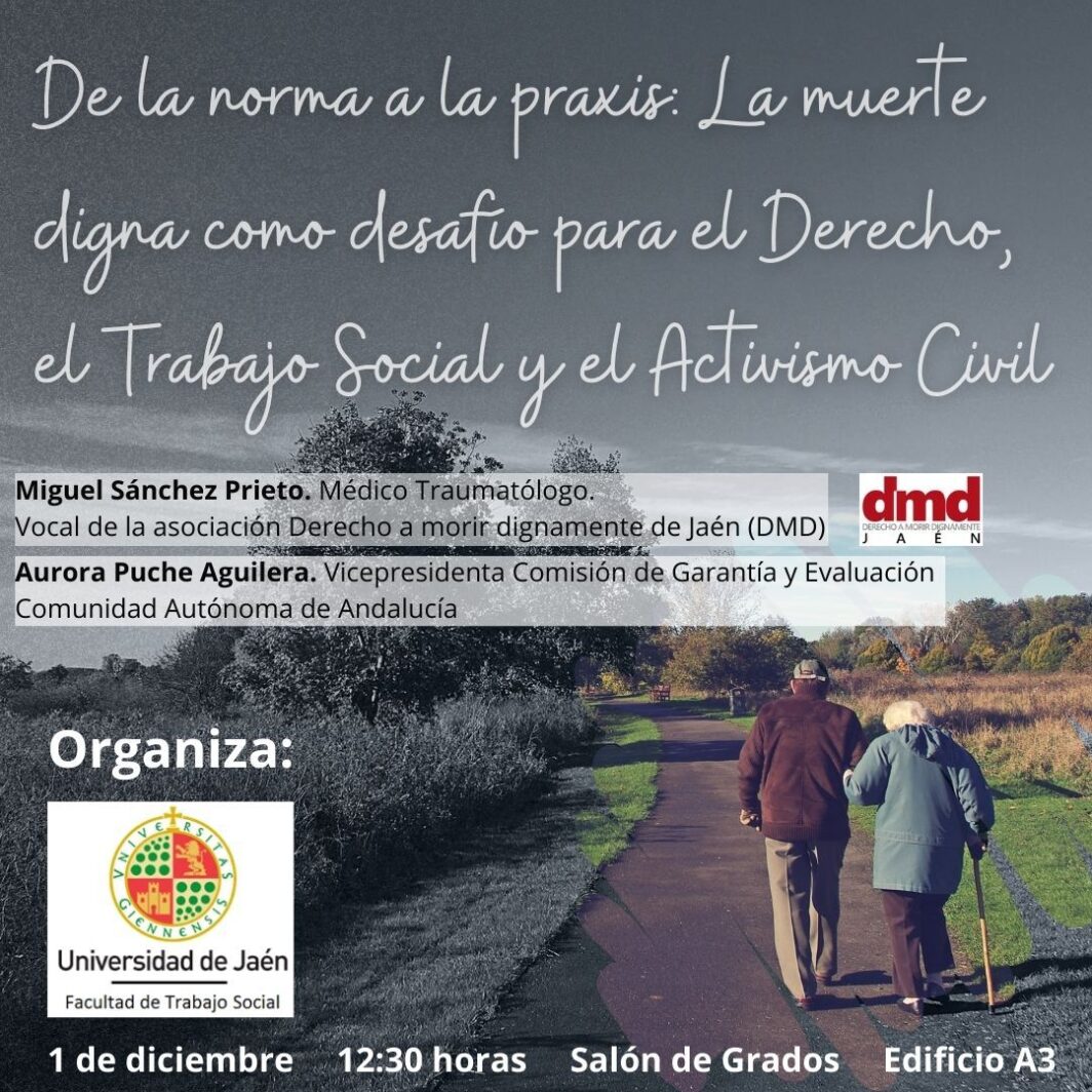 La Facultad de Trabajo Social de la Universidad de Jaén organiza el encuentro De la norma a la praxis: la muerte digna como desafío para el derecho, el trabajo social y el activismo civil, que tendrá lugar en el Salón de Grados (Edificio A3) el lunes 1 de diciembre a las 12,30 horas.