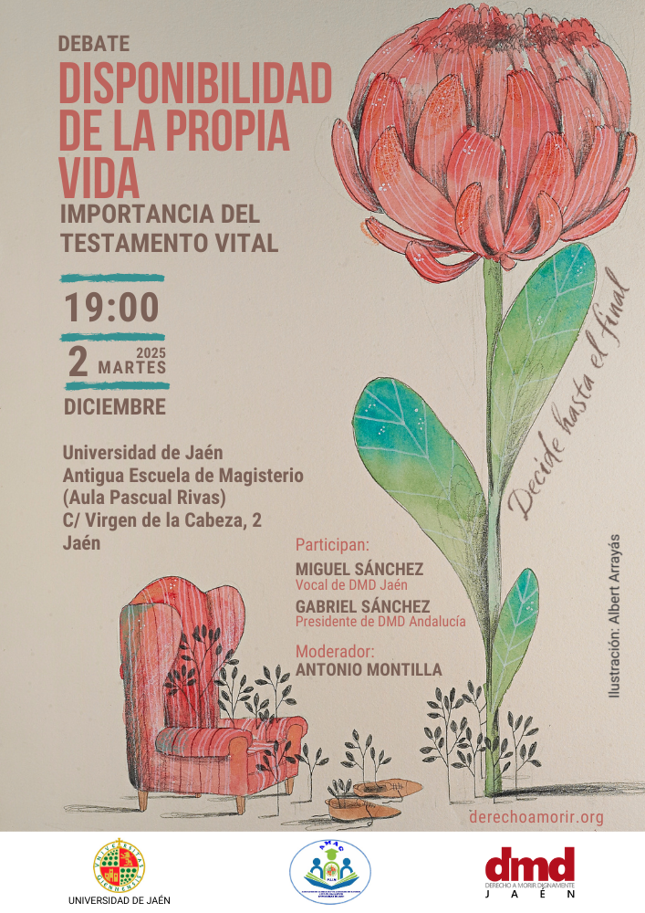 Derecho a Morir Dignamente (DMD) Jaén organiza el debate Disponibilidad de la propia vida: importancia del testamento vital con la participación de Miguel Sánchez, vocal de DMD Jaén, y Gabriel Sánchez, presidente de DMD Andalucía, y Antonio Montanilla como moderador.