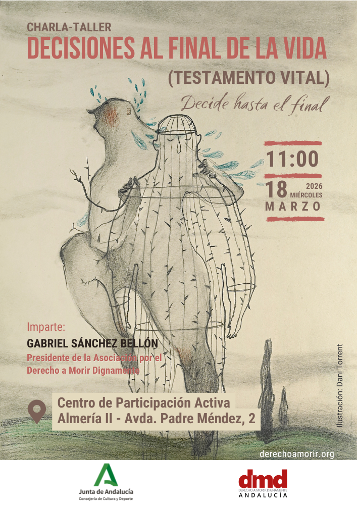 Derecho a Morir Dignamente (DMD) Andalucía organiza una charla-taller Decisiones al final de la vida el miércoles 18 de marzo, a las 11:00 horas en Almería.