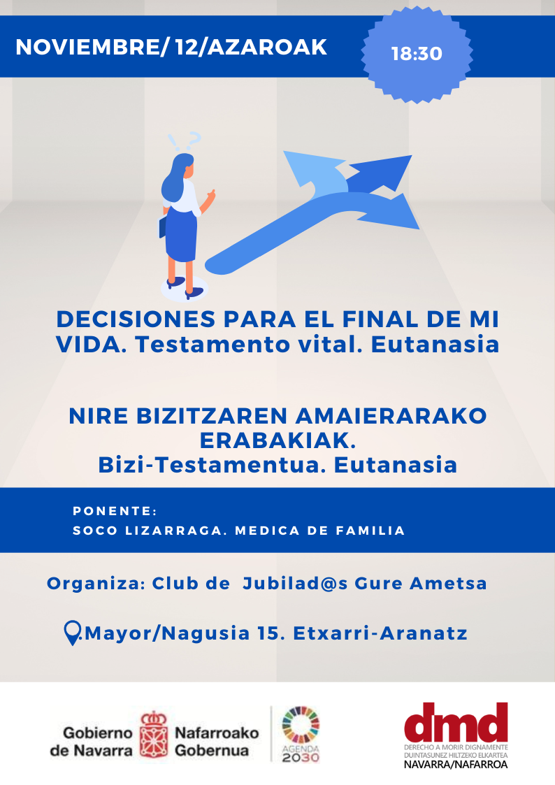 DMD Navarra organiza la charla «Decisiones para el final de mi vida. Testamento vital. Eutanasia» con la médica de familia Soco Lizarraga como ponente.