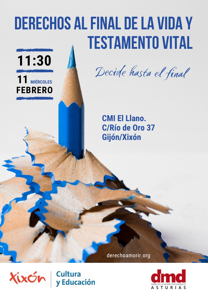 Derecho a Morir Dignamente (DMD) Asturias celebra el taller Derechos al final de la vida y testamento vital el miércoles, 11 de febrero a las 11,30 horas en el CMI El Llano, ubicado en la calle Río de Oro, 37, de Gijón.