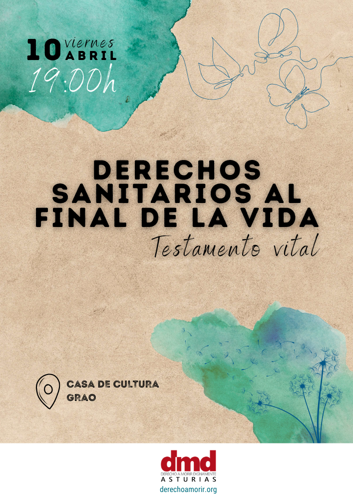 Derecho a Morir Dignamente (DMD) Asturias organiza el taller Derechos sanitarios al final de la vida: testamento vital, el viernes 10 de abril a las 19:00 horas en la Casa de Cultura de Grao, ubicada en la calle de Cerro de la Muralla, s/n.