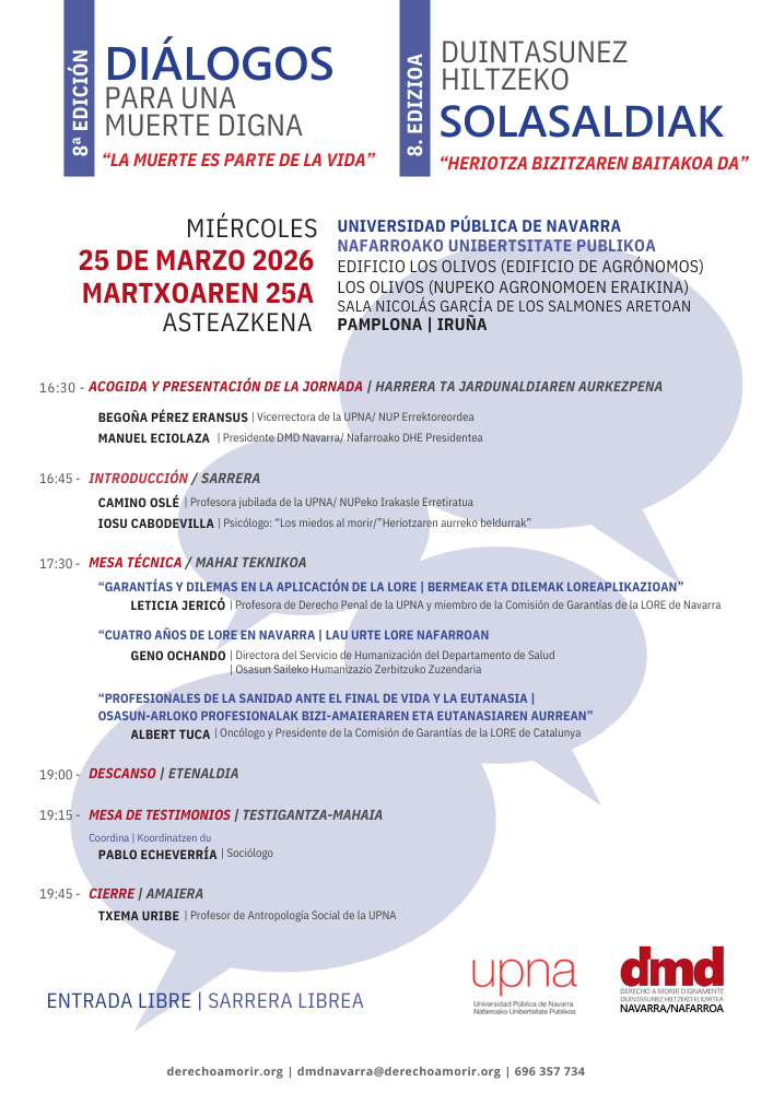 Derecho a Morir Dignamente (DMD) Navarra organiza el encuentro Diálogos para una muerte digna «La muerte es parte de la vida», que tendrá lugar el miércoles 25 de marzo a partir de las 16,30 horas en la Universidad Pública de Navarra.