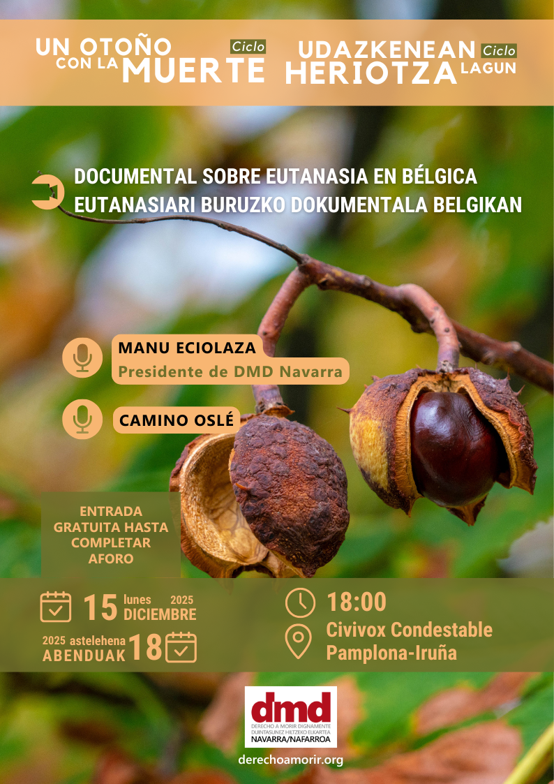 Como broche final al ciclo Un otoño de muerte, Derecho a Morir Dignamente (DMD) Navarra te invita a la proyección de un documental sobre eutanasia en Bélgica el lunes 15 de diciembre, a las 18:00 horas en el Civivox Condestable, ubicado en la calle Mayor, 2, de Pamplona-Iruña.