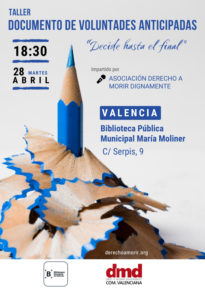 Derecho a Morir Dignamente (DMD) Com. Valenciana organiza un taller de documento de voluntades anticipadas el martes 28 de abril a las 18:30 horas en la Biblioteca Pública Municipal María Moliner, ubicada en la calle Serpis, 9.