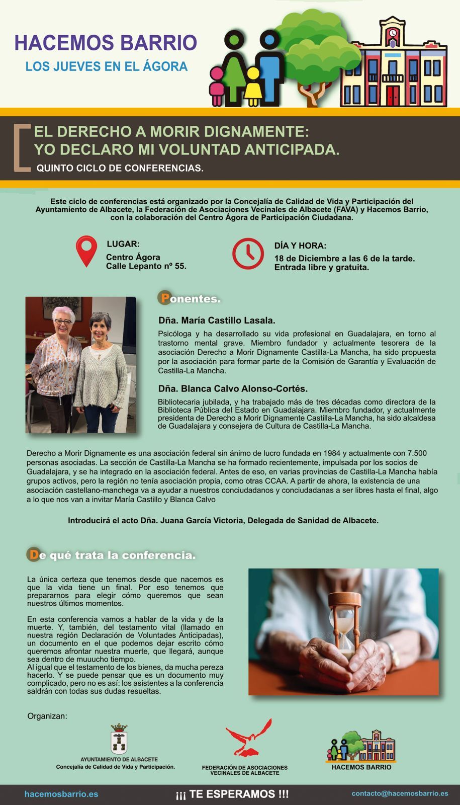 Derecho a Morir Dignamente (DMD) Castilla-La Mancha imparte de la conferencia El derecho a morir dignamente: yo declaro mi voluntad anticipada el jueves 18 de diciembre a las 18:00 horas en el Centro Ágora, ubicado en la calle Lepanto, 55, de Albacete.
