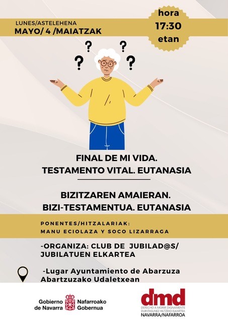 Derecho a Morir Dignamente (DMD) Navarra organiza un encuentro sobre Final de mi vida. Testamento vital. Eutanasia el lunes 4 de mayo a las 17,30 horas junto con el Club de Jubilados en el Ayuntamiento de Abarzuza.