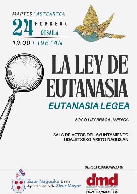 Derecho a Morir Dignamente (DMD) Navarra organiza una charla sobre la ley de eutanasia el martes 24 de febrero a las 19:00 horas en el Salón de Actos del Ayuntamiento de Zizur Mayor, ubicado en Parque Erreniega, 25. El encuentro estará a cargo de Soco Lizarraga, médica y socia de DMD.