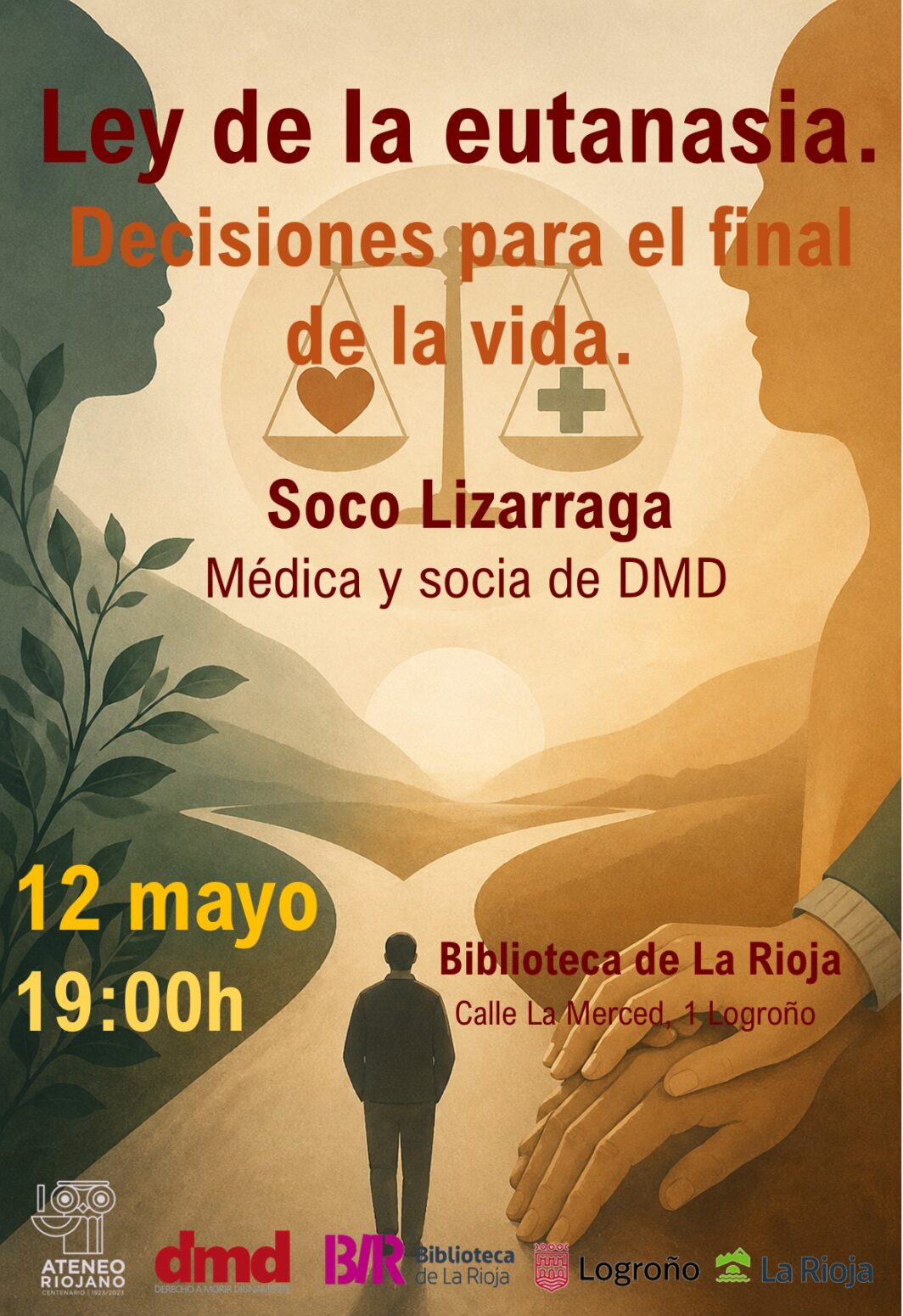Derecho a Morir Dignamente (DMD) organiza un encuentro sobre Ley de la eutanasia. Decisiones para el final de la vida el martes 12 de mayo a las 19:00 hora en la Biblioteca de La Rioja, ubicada en la calle de La Merced, 1, de Logroño.