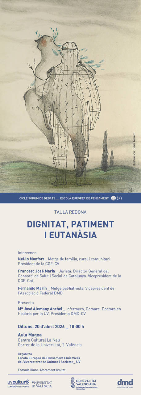 Mª José Alemany Anche, presidenta de DMD-CV presentará debate, que contará con la intervención de Nel·lo Monfort (médico de familia); Francesc José María (jurista) y Fernando Marín (médico paliativista).