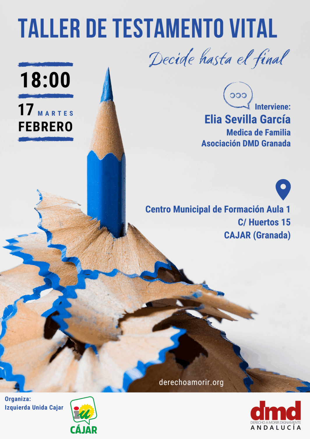 Derecho a Morir Dignamente (DMD) Andalucía organiza un taller de testamento vital el martes 17 de febrero a las 18:00 horas, en el Centro Municipal de Formación Aula 1, en la calle Huertos, 15, de Cajar (Granada).