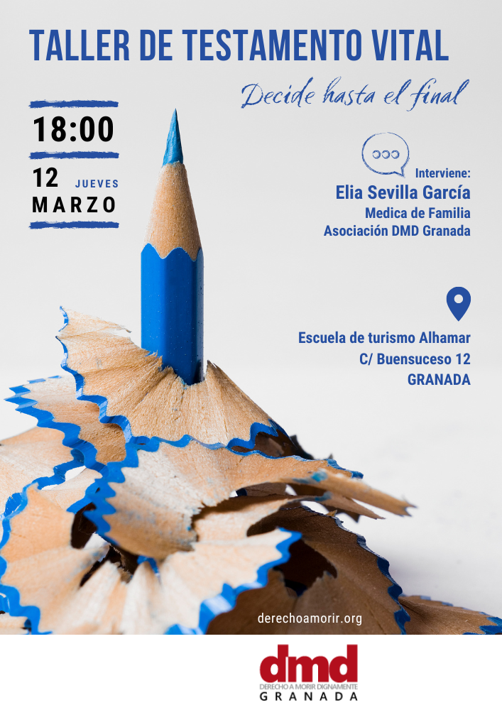 Derecho a Morir Dignamente (Granada) organiza un taller sobre testamento vital el jueves 12 de marzo, a las 18:00 horas, en Granada.