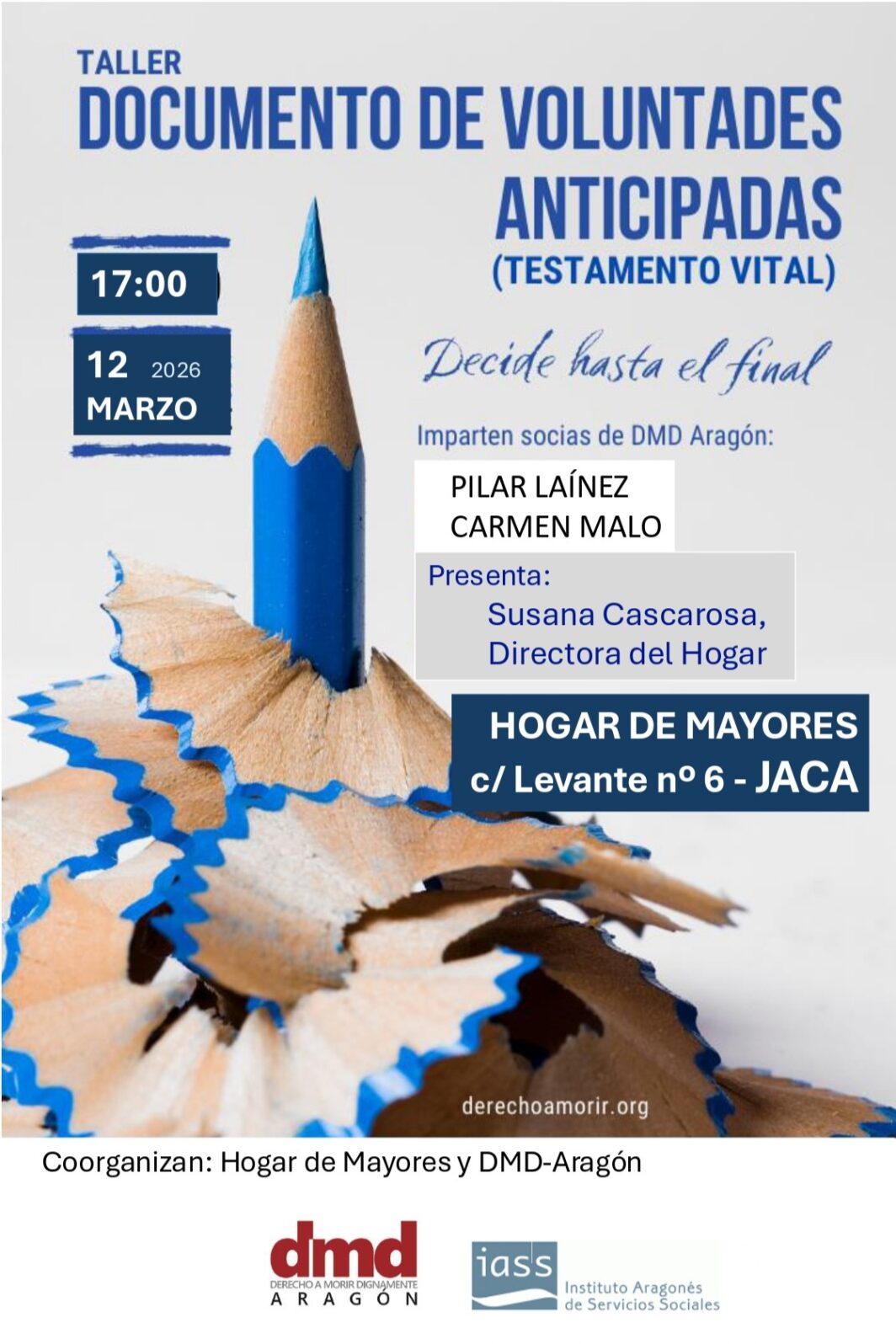 Derecho a Morir Dignamente (DMD) Aragón organiza un taller de Documento de voluntades anticipadas (testamento vital) el jueves 12 de marzo a las 17:00 horas en en el Hogar de Mayores, ubicado en la calle Levante, 6, de Jaca (Huesca).