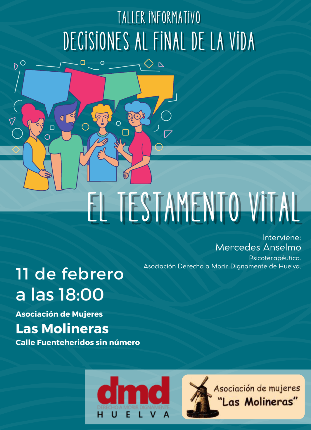 Derecho a Morir Dignamente (DMD) Huelva organiza el taller informativo Decisiones al final de la vida el miércoles 11 de febrero a las 18:00 horas en la asociación de mujeres Las Molineras, ubicada en la calle Fuenteheridos, s/n.