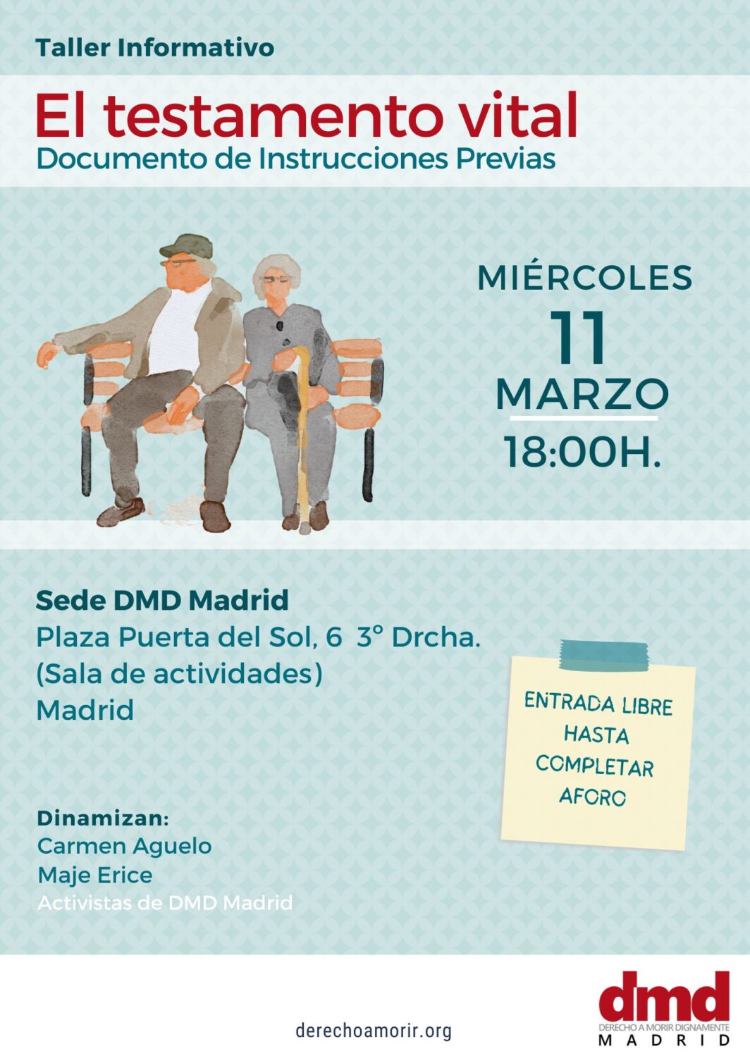 Queremos invitarte al próximo Taller informativo sobre Testamento Vital que tendrá lugar el MIÉRCOLES, 11 DE MARZO, A LAS 18:00H. en la sede de DMD Madrid, Plaza Puerta del Sol, 6 3º Dcha. (Madrid)