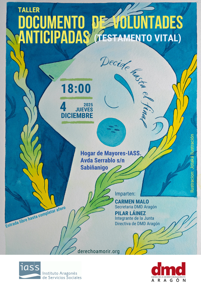 Derecho a Morir Dignamente (DMD) Aragón imparte un taller sobre documento de voluntades anticipadas (testamento vital) en el Hogar de Mayores-IASS de Sabiñánigo el jueves, 4 de diciembre, a las 18:00 horas, ubicado en la calle Serrablo, s/n.