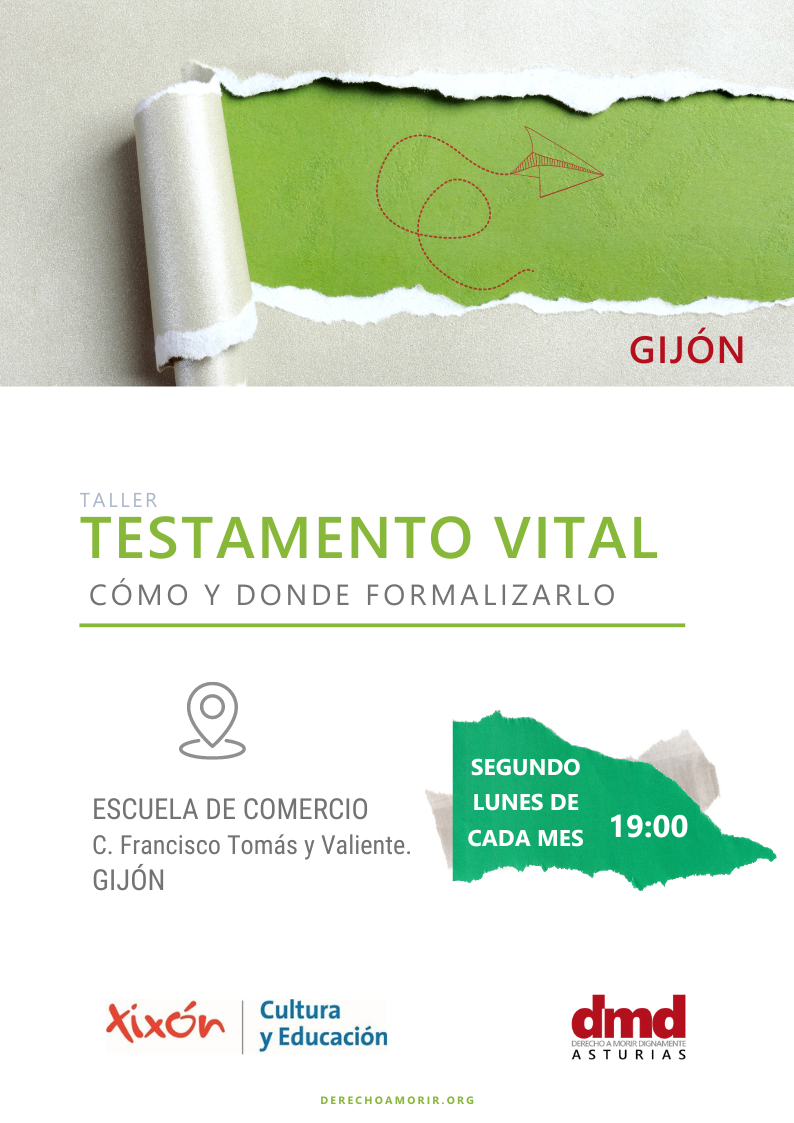 DMD Asturias organiza un taller sobre testamento vital en el que se detallará cómo y dónde formalizarlo. El encuentro tendrá lugar el lunes 10 de noviembre a las 19:00 horas en la Escuela de Comercio de Gijón, ubicada en la Calle Francisco Tomás y Valiente.