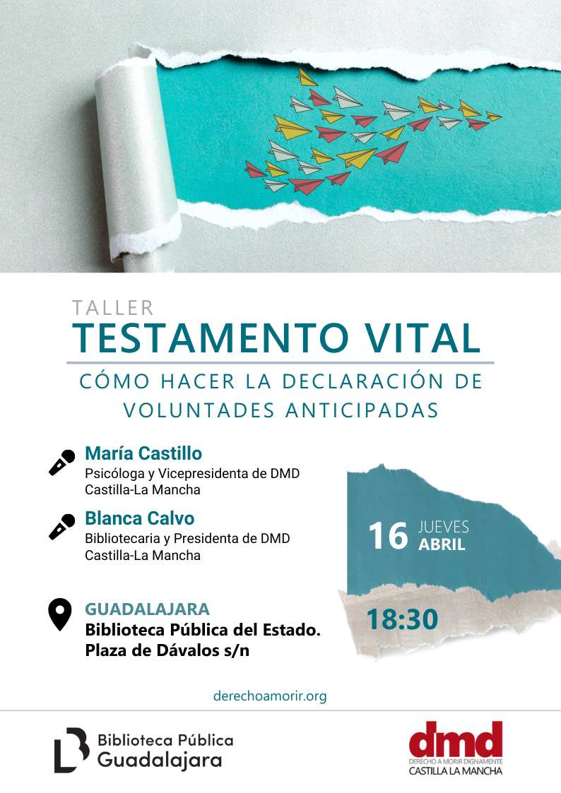Derecho a Morir Dignamente (DMD) Castilla-La Mancha organiza un taller sobre Testamento vital: cómo hacer la declaración de voluntades anticipadas el jueves 16 de abril, a las 18:30 horas, en Guadalajara.