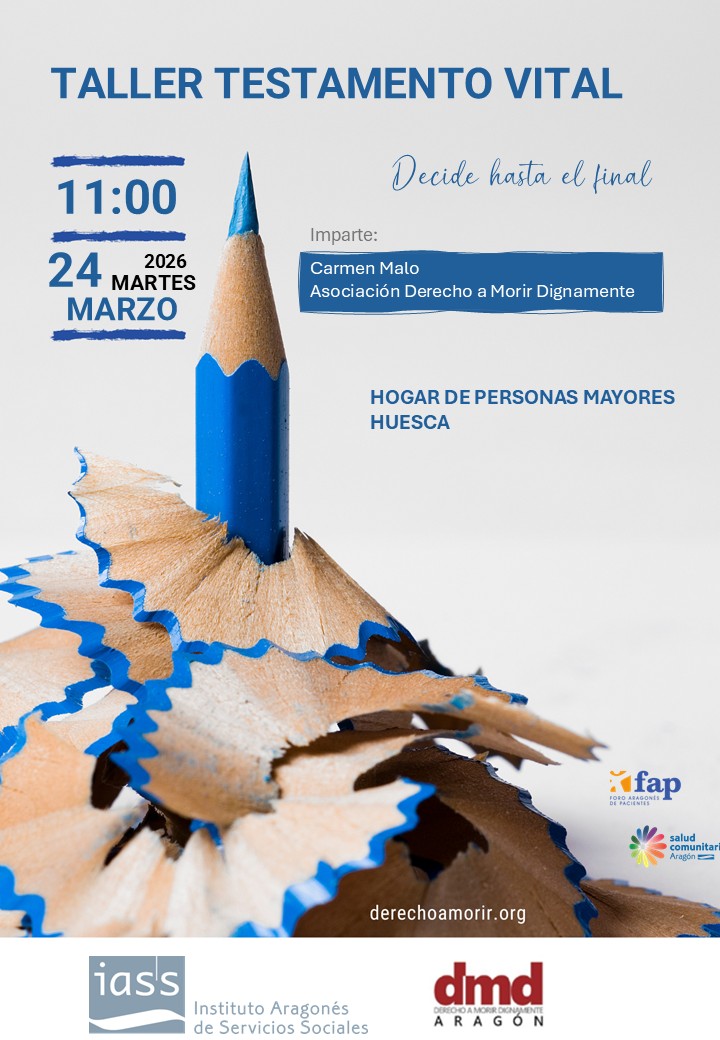 Derecho a Morir Dignamente (DMD) Aragón organiza un taller de testamento vital junto con el Instituto Aragonés de Servicios Sociales en el Hogar de Personas Mayores de Huesca, ubicado en la calle Pío XII, s/n.