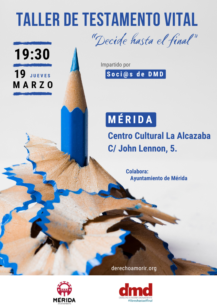 Derecho a Morir Dignamente (DMD) organiza un taller sobre Testamento vital el jueves 19 de marzo a las 19:30 horas en Mérida.
