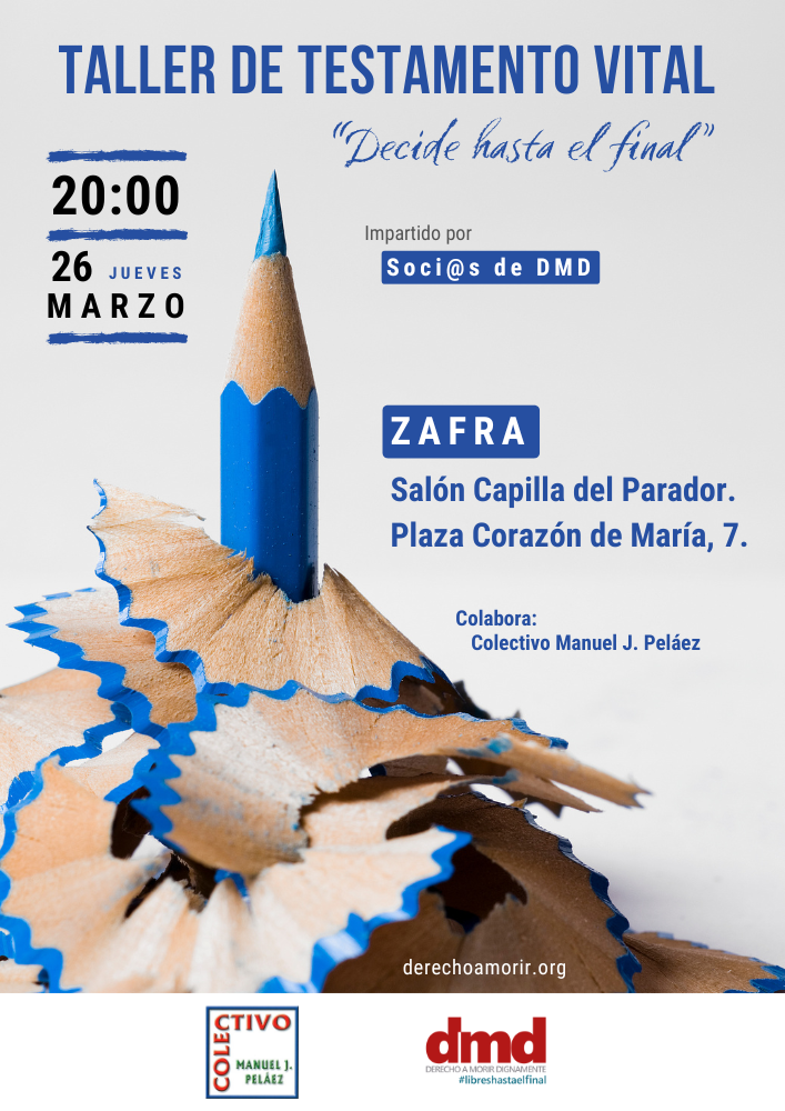 Derecho a Morir Dignamente (DMD) organiza un taller de Testamento vital el jueves 26 de marzo, a las 20:00 horas en el Salón Capilla del Parador de Zafra, ubicado en la Plaza Corazón de María, 7.