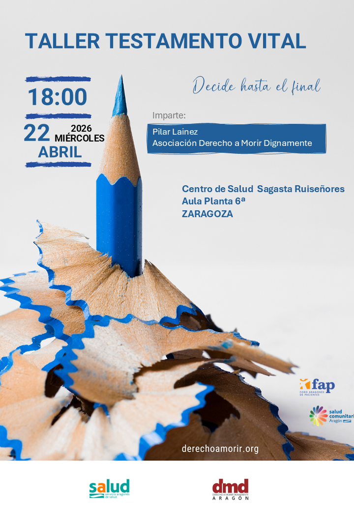 Derecho a Morir Dignamente (DMD) Aragón organiza un taller sobre testamento vital el miércoles 22 de abril a las 18:00 horas, en el Aula Planta 6ª del Centro de Salud Sagasta-Ruiseñores, ubicado en el Paseo Sagasta, 52, de Zaragoza.