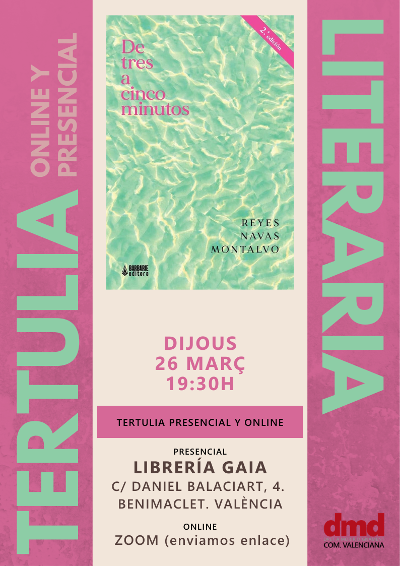 Derecho a Morir Dignamente (DMD) Comunidad Valenciana celebra una tertulia literaria en formato tanto presencial como online sobre el libro De tres a cinco minutos, de Reyes Navas Montalvo.