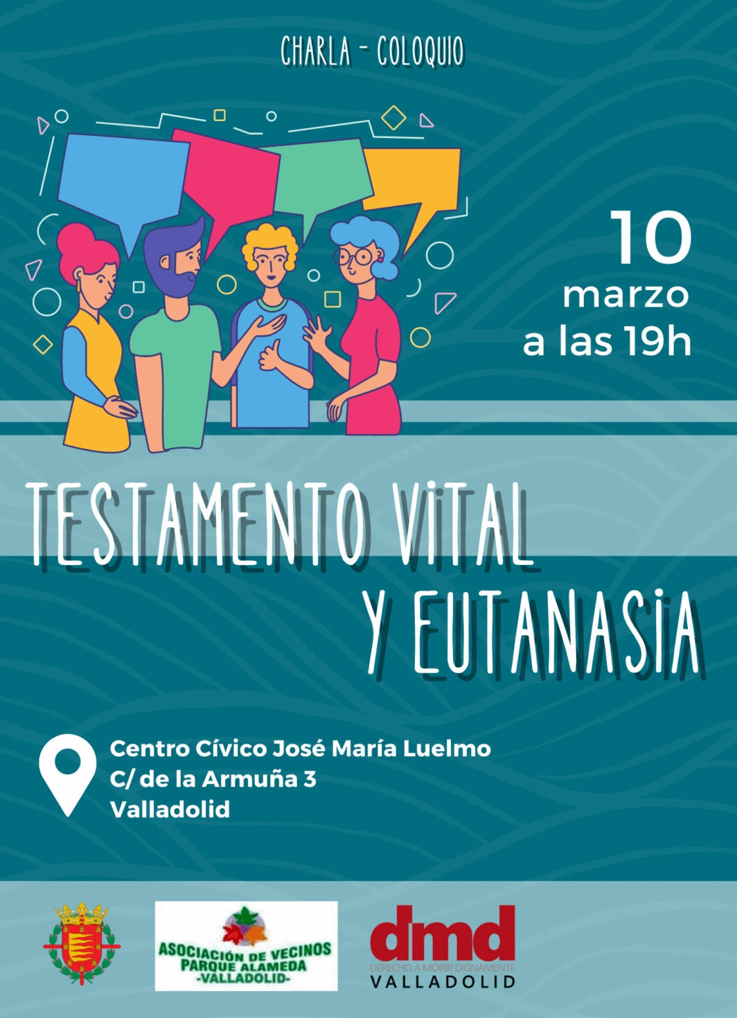 Derecho a Morir Dignamente (DMD) Valladolid imparte una charla-coloquio sobre Testamento Vital y eutanasia el próximo martes 10 de marzo a las 19:00 horas en el Centro Cívico José María Luelmo, ubicado en la calle de la Armuña, 3, de Valladolid.