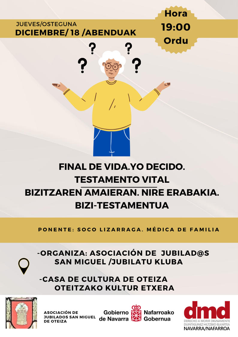 Derecho a Morir Dignamente (DMD) Navarra organiza la charla Final de vida. Yo decido. Testamento vital el jueves 18 de diciembre a las 19:00 horas en la casa de cultura de Oteiza. La charla, organizada con la asociación de jubilados San Miguel, estará a cargo de la médica de familia Soco Lizarraga.